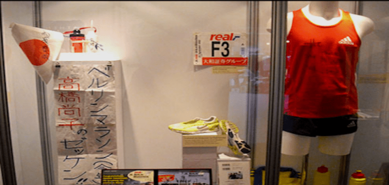Los zapatos usados por la corredora keniana Tegla Lorupe están en la exhibición junto al número de la carrera, los zapatos y la botella de agua utilizada por Naoko Takahashi cuando rompió la barrera del 2:20, el 30 de septiembre de 2001 (02:19:47).