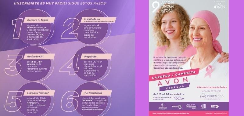 En paralelo, tendrá la oportunidad de entrenarse con nuestras clases que estarán disponibles durante esa semana”, explicó Jessica Palacios, Gerente de Marketing de Avon Perú. Además, desde el 18 al 25 de octubre, se podrá acceder a través de la página web a actividades de entrenamiento y nutrición. A través de este espacio virtual, Avon también busca brindar acompañamiento y apoyo a través de diferentes formatos informativos para seguir creando conciencia en la sociedad sobre la importancia del autoexamen y chequeos preventivos a tiempo, para que más mujeres puedan tener una detección oportuna.